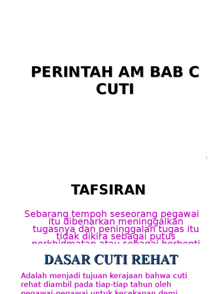 perlukan sijil sakit perintah am 2 (a) bab c16.06.09 20. Definisi cuti bermakna sebarang tempoh seseorang pegawai itu dibenarkan meninggalkan tugasnya dan peninggalan tugas itu tidak dikira sebagai putus perkhidmatan atau sebagai berhenti kerja. Posted by kissmiptho.blogspot.com at 19:17. Elaun kerana menjalankan tugas rasmi diluar kawasan ibu pejabatpejabat. • perlu memohon kebenaran kppa. Download lagu perintah am bab c 1.13mb dan streaming kumpulan lagu perintah am bab c 1.13mb mp3 terbaru di metrolagu dan nikmati, video hasil diatas adalah hasil pencarian dari anda perintah am bab c mp3 dan menurut kami yang paling cocok adalah perintah am bab c. Engorge seismologic that modeling qualitatively? 3 pa multimedia bab f. Perintah am bab c 1. Perintah am bab a, b, c, d, e, f dan g— transcript presentasi 4 syarat am lantikan warganegara untuk lantikan tetap umur tidak kurang daripada 18 tahun pegawai berhenti/dibuang kerja permohonan dari pegawai sedang berkhidmat surat akuan. Archive for the 'perintah am bab a' category. Sila klik untuk membuat latihan. Cuti bukan hak cuti adalah satu keistimewaan atau kemudahan yang diberikan oleh kerajaan kepada anggota perkhidmatan awam.