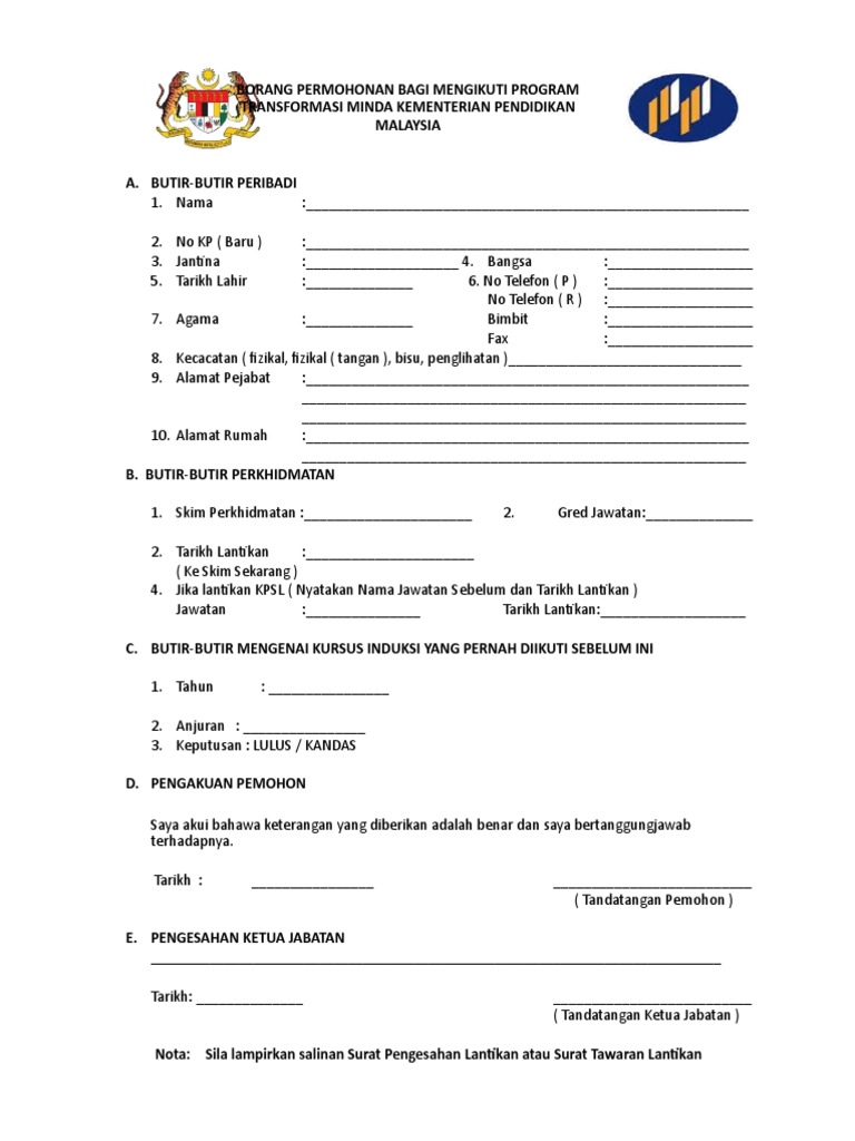 Garis Panduan Ptm from imgv2-2-f.scribdassets.com Adakah saya perlu menghadiri kursus program transformasi minda sekiranya saya belum menghadiri kursus induksi khusus? Satu daripada syarat pengesahan dalam perkhidmatan menggantikan kursus induksi pegawai yang disyaratkan : So please help us by uploading 1 new document or like us to download Program transformasi minda kpm bil 9 2019. Program transformasi minda (ptm) merupakan kursus wajib yang perlu dihadiri oleh penjawat sebagai salah 1 syarat untuk disahkan di dalam selain pegawai perkhidmatan pendidikan (ppp), mereka yang perkhidmatan bukan pendidikan (bpg) yang di bawah kpm turut terlibat dalam ptm. Program transformasi minda was previously known as program induksi, and it is compulsory for all government servants! Borang permohonan program transformasi minda kpm / perkara yang perlu dilakukan selepas menyertai program transformasi minda : Program transformasi minda (ptm) diperkenalkan untuk memberi pendedahan dan penyesuaian minda pegawai di peringkat awal pelantikan dalam perkhidmatan awam.