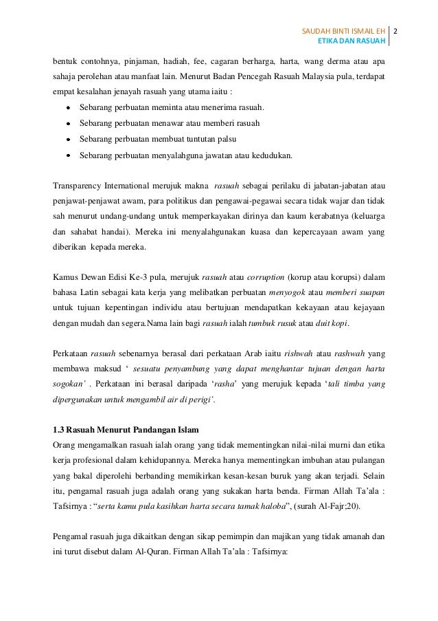Rasuah Menurut Islam Docx Document from demo.vdocuments.mx Ringkasnya, orang yang mempunyai integriti tidak akan terjebak dengan gejala rasuah manakala orang yang sebaliknya, sama ada yang memberi atau menerima, dikatakan tidak berintegriti. وَلَا تَأْكُلُوا أَمْوَالَكُم بَيْنَكُم بِالْبَاطِلِ وَتُدْلُوا بِهَا إِلَى الْحُكَّامِ لِتَأْكُلُوا فَرِيقًا مِّنْ أَمْوَالِ النَّاسِ بِالْإِثْمِ وَأَنتُمْ تَعْلَمُونَ. 188 rasulullah saw bersabda mafhumnya allah mengutuk pemberi rasuah dan sesiapa yang menerima rasuah dalam hukuman30 jelas dalam islam bahawa perbuatan rasuah adalah suatu perbuatan yang haram dan terkutuk. Istilah rasuah telah digunapakai dalam bahasa melayu yang bermaksud pemberian untuk menumbuk rusuk iaitu menyogok, menyuap. Prinsip ini akan membawa kepada setiap pekerja untuk melaksanakan sesuatu tugasan dengan betul dan sempurna pada setiap masa walau di mana mereka berada. Maksud rasuah dalam islam for more information and source, see on this link : Menyalahgunakan kedudukan atau jawatan untuk kepentingan tertentu. Pembahagian kesalahan jenayah dalam islam qisas hudud ta'zir 4.