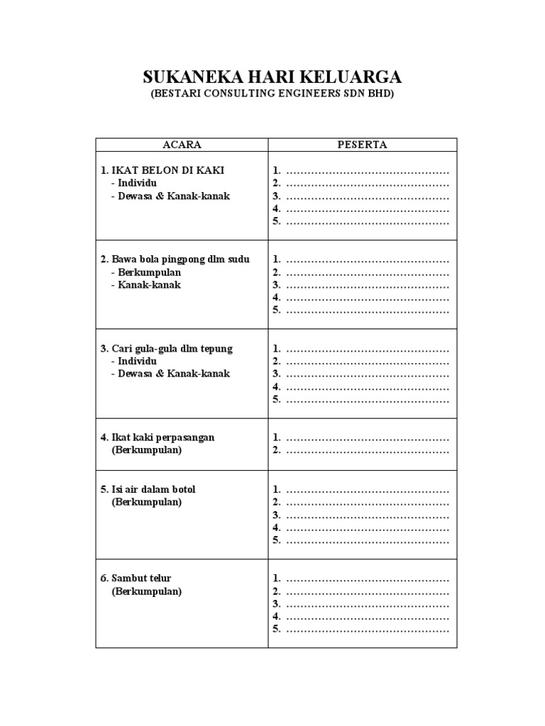 Pakej c ( 2 hari 1 malam ). Kalau buat hari keluarga wajib ada sukaneka! Ape lagi kome cer tgk! Maiyahan #sinaubareng hari keluarga, hari kita semua (part 1) sinau bareng cak nun dan kiaikanjeng mojokerto, 30 juni. Sukaneka hari keluarga smk muadzam jaya 2019. 1.2 ianya sudah pasti akan menjadi harapan kepada jawatankuasa pelaksana selain ianya menjadi satu aktiviti riadah. Aktiviti sukaneka pelbagai kategori yang disertai oleh penduduk kampung. Text of gambar sukaneka bakti siswa. Turut hadir memeriahkan program adalah yb puan rozana binti zainal abidin, ahli dewan negeri permatang. Terdapat banyak aktiviti yang telah dilaksanakan sepanjang tahun. Disember 2012 3.2 tempoh : 5.00 pagi hingga 6.30 petang. Bila planning nak buat hari keluarga, isteri saya akan dapatkan tempahan di rumah peranginan persekutuan, dan kemudian buat perancangan soal bajet lain termasuklah makan minum, aktiviti keluarga, aktiviti lawatan (jika ada) atau buat game semasa hari keluarga.